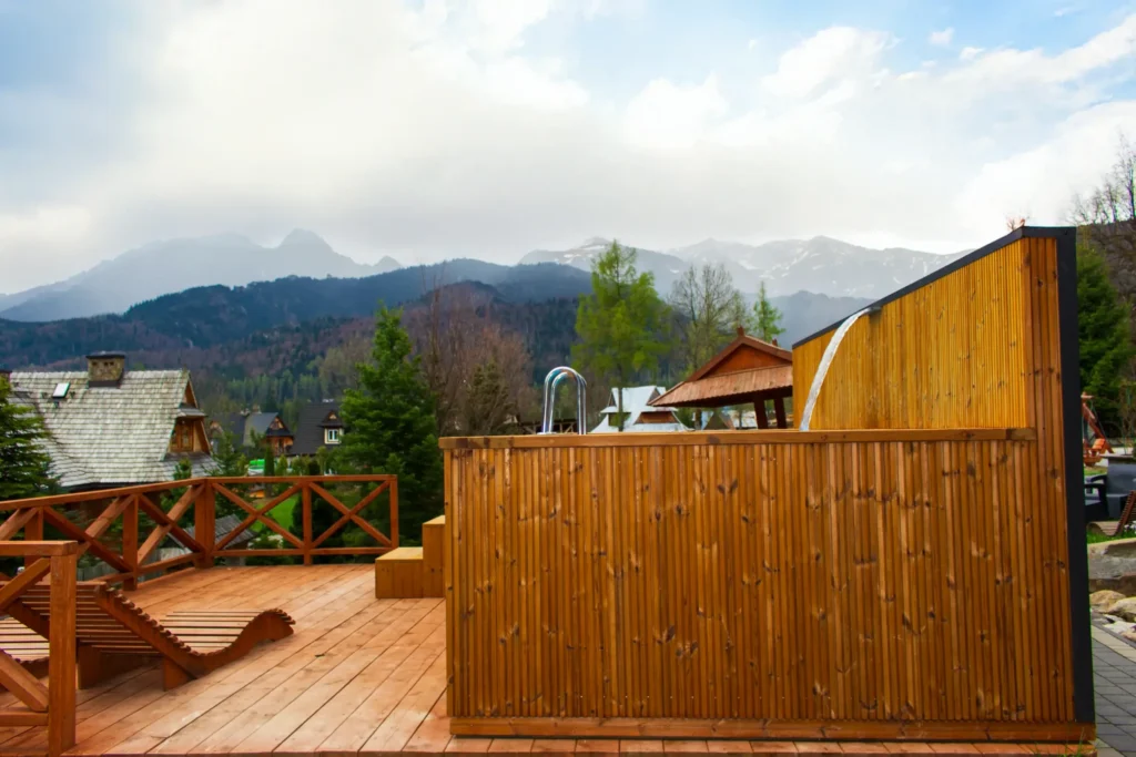 Zewnętrzna część basenu zachwyca nowoczesnym designem dzięki luksusowej elewacji wykonanej z drewnianych lameli Thermo. To stylowe wykończenie nie tylko nadaje niepowtarzalnego, ekskluzywnego charakteru, ale również gwarantuje podwyższoną trwałość i stabilność wymiarową drewna przez lata użytkowania.